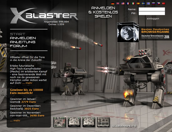 Das Shooter Spiel XBlaster, ein Echtzeit Online Spiel, handelt von Kampfrobotern, den sogenannten Mechs, die in einer verrohten, futuristischen Welt in einer Arena zu brutalen Kämpfen antreten. Zu Beginn erhältst Du einen Mech, Dir stehen drei Grundtypen zur Auswahl: der Hunter, der Ranger und der Defender. Jeder dieser Mechs hat spezielle Fähigkeiten, die mehr oder weniger auf Fern- oder Nahkampf ausgelegt sind. Zudem besitzt jeder Mech eine Spezialwaffe, die er im Kampf nur begrenzt einsetzen kann. Mache Dich mit verschiedenen Schilden und Waffen vertraut, damit Du in der Arena gegen Deine Gegner bestehen wirst. In Deinem Hangar kannst Du Deinen Mech mit Kanonen, Schilden oder stärkeren Panzerungen aufrüsten. Löst du verschiedene Missionen erhöhst Du Deine Skill-Punkte und Deinen Credit-Bestand. Im Spielverlauf kannst Du Dir weitere Mechs kaufen und sie unterschiedlich und individuell aufbauen und ausrüsten. In der Arena bestreitest Du packende Kämpfe gegen andere Online Spieler, die ihre Mechs steuern. Mit den anderen Spielern kannst Du in Deinem Hangar per Chat in Kontakt treten. Außerdem kannst Du Dir mit ein paar Euros Credits beschaffen, um Deine Mechs schneller aufzurüsten. XBlaster ist ein kostenloses Online Game, bei dem Du Dir mit einem Premium-Account Credits und zahlreiche Turniere sichern kannst.